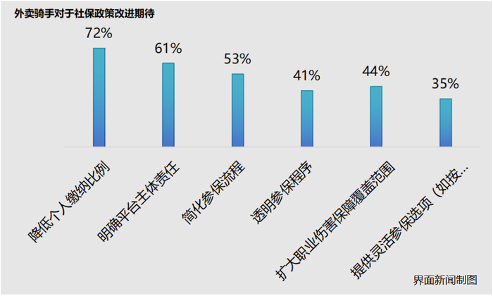 11.降低个人社保缴费比例,明确平台主体责任道出了骑手心声。在外卖骑手对于社保政策改进方面,“降低个人缴费比例”“明确平台责任”以及“简化参保流程”这三个选项的占比位居前列。
