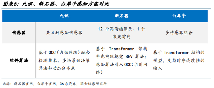 九识、新石器、白犀牛感知方案对比。目前市场中大部分无人物流车企业选择多传感器组合方式,算法选择基于 OCC(占据网络)融合检测技术、多场景预决策算法和动态分布式。