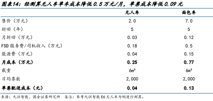 整车价格不断下降为商业模式跑通提供硬件基础。2024 年邮政快递物流 3-10 立方的无人车成本与普通新能源车基本持平,大规模量产应用条件成熟。多家第三方运营主体进入行业,商业模式形成闭环,无人车运营进入良性循环。这个价格还在下降,大规模量产应用条件已成熟。E 系列首款车型 E6 正式售价 19800 元,以超高性价比开启轻件散件智能配送新时代。E 系列将提供丰富的选装配置方案,满足用户多样化场景需求。同时创新推出行业颠覆性的 FSD(完全智能驾驶)月度订阅服务,低至 1800 元/月,彻底改变行业传统包年付费模式,实现"随用随付"的灵活体验,大幅降低用户使用门槛。