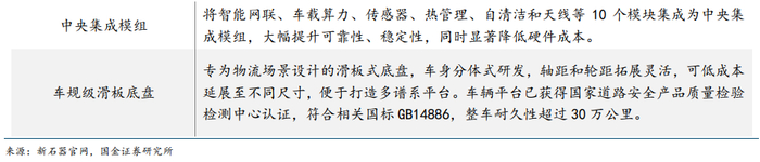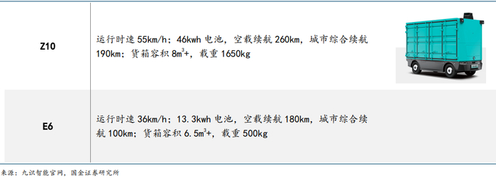 (1)九识智能:高性价比 L4 城配先锋。5 月 27 日,九识正式发布全新 E 系列无人物流车平台及首款车型 E6。新车正式售价 19800 元,较初代车型降价超 90%,以超高性价比开启轻件散件智能配送新时代。九识智能专注于 L4 级无人城配车辆的研发与应用。截至目前,公司针对不同载重场景优化设计推出 Z 系列、E6 等无人驾驶车型,构建起成熟的全栈自动驾驶技术方案。