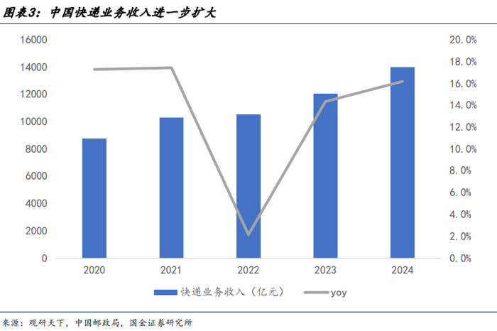 物流快递行业增速,市场规模进一步扩大。2024 年,邮政行业业务收入(不包括邮政储蓄银行直接营业收入)累计完成 1.7 万亿元,同比增长 10.7%。其中,快递业务收入累计完成 1.4 万亿元,同比增长 13.8%。2024 年,邮政行业寄递业务量累计完成 1937.0 亿件,同比增长 19.2%。其中,快递业务量累计完成 1750.8 亿件,同比增长 21.5%。同城快递业务量累计完成 156.4 亿件,同比增长 14.6%;异地快递业务量累计完成 1555.7 亿件,同比增长 22.1%;国际/港澳台快递业务量累计完成 38.7 亿件,同比增长 26.3%。