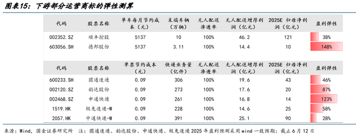 顺丰控股、顺丰同城:均间接参股无人物流车厂商白犀牛,其中 2024 年顺丰控股已投入 800 台无人车,顺丰同城已投入 200 台无人车,顺丰控股旗下拥有 10 万辆末端车辆,若单车节省成本 5100 元/月(增厚利润 3900 元/月,假设所得税率为 25%),100%替换现有存量车辆,预计可增厚利润 46 亿元;