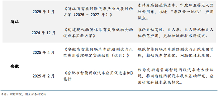 国家和地方政府加速推进无人物流,解决无人车路权问题。政策端,无人物流是降低物流成本的途径之一。2024 年 11 月,中共中央办公厅、国务院办公厅印发《有效降低全社会物流成本行动方案》,目标到 2027 年社会物流总费用与国内生产总值的比率力争降至13.5%左右;《有效降低全社会物流成本行动方案》提出推动物流数智化发展,鼓励发展与平台经济、低空经济、无人驾驶等相结合的物流新模式;《“十四五”现代物流发展规划》、《交通运输大规模设备更新行动方案》等政策也提出对无人化物流的支持。国家邮政局、多地政府、邮管局密集表态加速推进无人车、无人机应用工作。