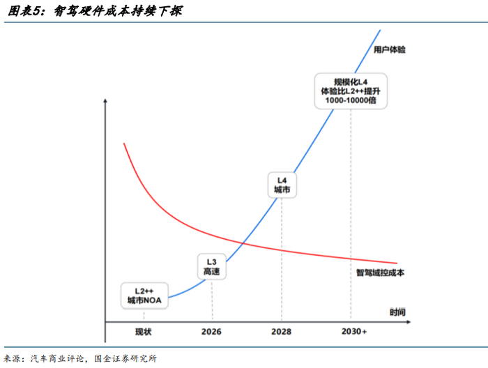 规模化放大成本优势,市场需求倒推。头部车企的规模化采购放大成本优势,通过规模效应将整套智驾成本控制在 4000 元以下,随着客户认知加强,未来中介智驾有望成为刚需,推动车企加速标配。