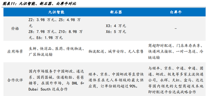 当前中有无人车制造主要为:九识智能、新石器、白犀牛