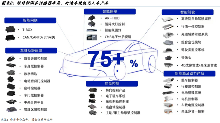 域控制器:建议关注经纬恒润、知行科技。 经纬恒润:为汽车电子系统科技服务商,专注于为全球汽车、无人运输等领域的客户,提供电子产品、研发服务和高级别智能驾驶整体解决方案。车规级硬件研发能力与规模化量产经验丰富,核心产品及服务打破国外垄断,技术实力及市场竞争力在国内供应商中稳居第一梯队。白犀牛与经纬恒润合作,白犀牛的自动驾驶算法与场景落地经验,深度融合经纬恒润车规级成熟可靠的传感器、高算力智能驾驶域控制器等智能硬件的产品技术优势和强大工程化能力,打造高度可靠和安全的车规级无人车产品。
