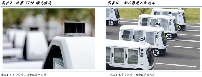 无人物流车产业链梳理。上游主要为零部件和技术方案公司:看好智驾芯片、域控制器、激光雷达三个赛道。智驾芯片:首推地平线机器人,关注黑芝麻智能。无人车爆发直接拉动芯片需求激增,每台车需配套计算芯片需满足百 TOPS级算力需求。视觉感知技术路线普及,推动图像处理器芯片研发加速,芯片厂商需针对无人车场景定制低功耗、高可靠性方案。激光雷达:首推禾赛科技。无人物流车大多采用多传感器方案,禾赛科技作为激光雷达龙头企业,有望充分受益新应用场景。禾赛激光雷达深化赋能新石器无人车规模化落地,作为核心传感器,禾赛 XT 激光雷达将无人驾驶感知系统提升到 120m 感知距离。域控制器方面,白犀牛的自动驾驶算法与场景落地经验,深度融合经纬恒润车规级成熟可靠的传感器、高算力智能驾驶域控制器等智能硬件的产品技术优势,打造高度可靠和安全的车规级无人车产品;知行科技近期拿到某头部自主品牌合计 9 款商业物流车的平台化定点函。