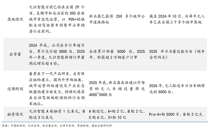 九识智能:构建起覆盖快递快运、生鲜商超、医药冷链等的智慧城配物流网络。在国内市场已深度服务中国邮政、通达系、国药器械、佳通轮胎、爸爸糖等多场景行业客户及其生态合作伙伴,在海外市场,九识智能也在积极推进其全球化战略,已落地新加坡、日韩、中东等区域,无人车产品已进入新加坡 FairPrice 等本土龙头企业供应链体系,与 DHL 和 Dubai South 达成合作。公司持续技术创新,两年内多次迭代产品,首创“双目 3D 感知+平顶智能套件”融合方案,E6 车型裸车价 1.98 万元,推动城配自动驾驶发展。2024年订单超万台,交付超 3000 台,服务超 600 家客户,运营覆盖 200 余座城市,L4 运营总里程超 1200 万公里。B 轮融资近 3 亿美元。