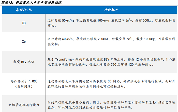 (2)新石器:L4 全场景布局引领者。新石器无人车(Neolix)成立于 2018 年,是国内较早深耕物流无人驾驶的 L4 厂商之一。公司以“AI 算法+机器人+电动汽车”三重技术优势作为核心竞争优势,旗下 X 系列车型已实现冷链运输等多种载货需求覆盖。