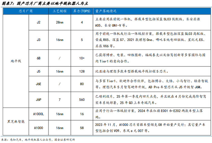 智驾芯片:首推地平线机器人,关注黑芝麻智能。无人车爆发直接拉动芯片需求激增,每台车需配套计算芯片需满足百 TOPS 级算力需求。视觉感知技术路线普及,推动图像处理器芯片研发加速,芯片厂商需针对无人车场景定制低功耗、高可靠性方案。预计 2025 年全球无人配送车芯片市场规模将突破 50 亿美元,中国占比超 30%。随着 L4 级立法落地与智能驾驶产业链成熟,芯片与无人车企业的协同研发(如定制化域控解决方案)将成为技术突破关键。芯片厂商中国产替代正当时,中大算力芯片中,建议关注国产智驾芯片龙头地平线。地平线:中算力芯片处于行业前列,开启国产替代,中大算力芯片加速落地中。地平线中算力芯片推出征程 5、征程 6M 和征程 6E。征程 5:J5 算力为 128TOPS,目前已有比亚迪、理想汽车多款车型搭载,截止 2024 年,征程 5 以 26.9 万出货量(5.1%市场份额)位居行业第四。25 年预计 J6M 将开启大规模落地,J6P 将在奇瑞车上首次搭载。