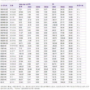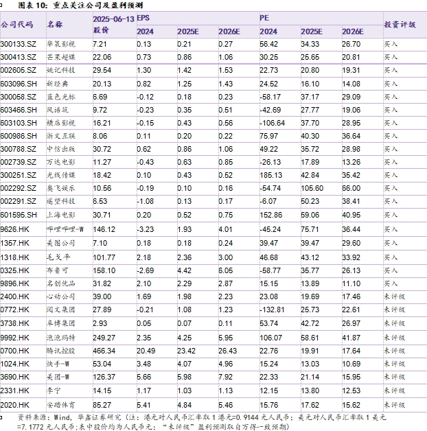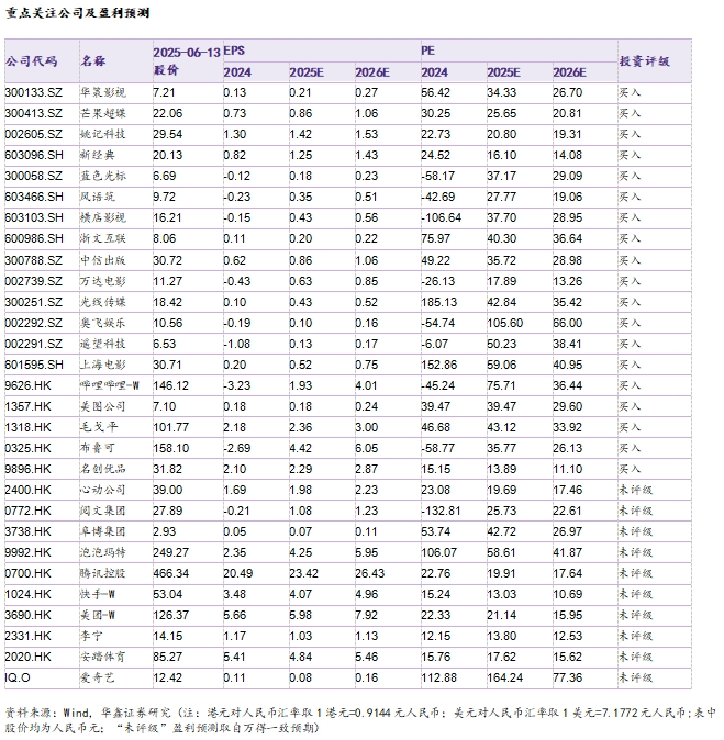 给予传媒行业推荐评级。A股可关注,天舟文化300148(教辅与双主业有望业绩持续修复,新业务AI+教育可期);万达电影002739(关注谷子经济进展如光与夜之恋IP进行联名,以及暑假档新供给);上海电影601595(关注上影节进展及电影《浪浪山小妖怪》);横店影视603103(下沉市场内需仍游戏具潜力,关注暑假档进展);姚记科技002605(关注伴随卡游的情绪驱动下带动公司卡淘带动的估值修复);华策影视300133(加码短剧外,积极布局AI,借力AI赋能创作与营销);芒果超媒300413(综艺《歌手2025》上映后公司推出芒果超品俱乐部(Mango CHAOPIN Club)服务产品);遥望科技002291(2月激励夯实信心底,AI+电商较好应用场景之一);奥飞娱乐002292(谷子经济代表企业,AI+IP有望持续推动热度);风语筑603466(新业务端从XR应用到具身智能应用均在持续探索);蓝色光标300058(旗下产品积极携手applovin服务商家);浙文互联600986(公司积极推进数字文化的创新探索,拓展数字文化商业化空间);中信出版300788(央企,大众阅读头部企业持续夯实主业);港股可关注,B站9626(7月将迎接BiliBili World2025);腾讯0700(拟外延收购游戏公司,关注微信交易生态后续进展);阿里9988(基本盘持续夯实,以AI为支点撬动时代红利);阜博集团3738(全球领先的数字内容保护与交易服务提供商);美图1357(将进一步以AI技术打造世界级的产品,更好去服务生活场景与生产力产品用户的垂直需求);布鲁可0325(中国版乐高有望在2025年主业持续夯实,自研IP后续发展可期,布鲁可诺亚奥特曼传奇版热销中);名创优品9896(新消费主义全球综合零售龙头,IP战略下有望带来量价齐升,TOPTOY在潮玩市场具有先发优势)、毛戈平1318(2025年以来护肤品表现强劲, 618期间维持高速增长,有望持续贡献收入)。
