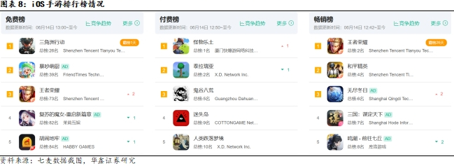 手机游戏方面,排行榜情况如下所示,免费榜排名前三的手游为《三角洲行动》《暴吵萌厨》《王者荣耀》,畅销榜排名前三的手游分别为《王者荣耀》《和平精英》《无尽冬日》。