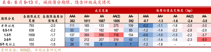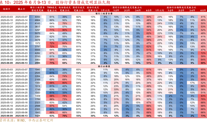 从经纪商成交来看,6月9-13日银行资本债成交笔数环比下降,但成交情绪较好,二级资本债TKN占比由68%升至71%,低估值占比由66%升至68%;永续债TKN占比小幅下降3pct至63%,但低估值占比由66%升至76%。从期限结构来看,国有行成交仍集中于流动性较好的长久期品种,二级资本债4-5年成交占比环比上升5pct至51%,永续债4-5年占比下降2pct至64%;股份行成交明显拉久期,二级资本债、永续债4-5年占比分别上升4pct、7pct至68%、73%。