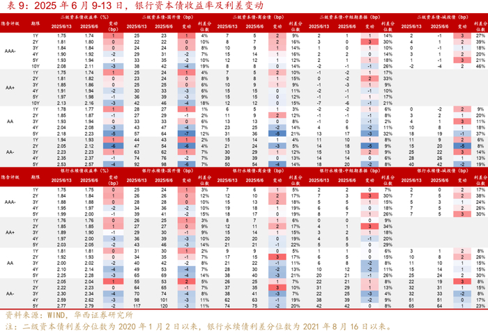 6月9-13日银行资本债表现分化,中短端信用利差多小幅走扩,中长久期收益率下行且利差收窄。4-5Y和10Y二级资本债、3-5Y银行永续债收益率普遍下行1-5bp,利差收窄1-7bp,其中5Y中小行二级资本债收益率下行4-5bp,利差收窄6-7bp。