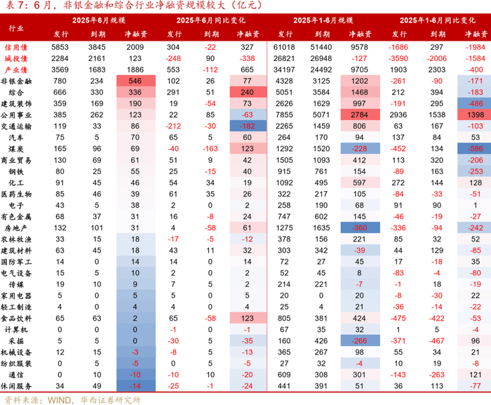 6月,产业债发行、净融资规模同比均上升。6月1-15日,产业债发行3569亿元,同比增加553亿元,净融资1886亿元,同比增加665亿元。其中,非银金融和综合行业净融资规模较大,分别为546、336亿元。发行情绪转弱,全场倍数3倍以上占比由41%降至38%,2-3倍占比由33%降至24%。