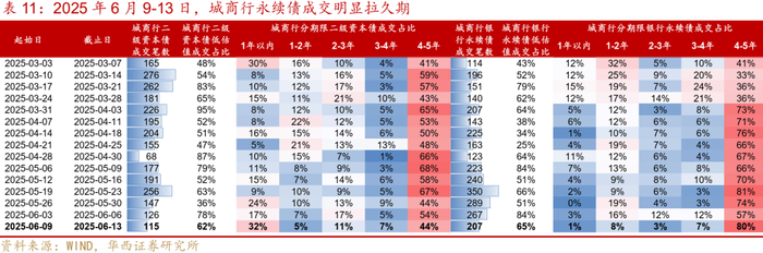 城商行成交情绪明显转弱,二级资本债、永续债低估值占比分别环比下降16pct、19pct至62%、65%。从成交期限来看,城商行二级资本债和永续债表现分化,二级资本债成交缩久期,4-5年成交占比环比减少10pct至44%,1年以内占比则由17%升至32%;永续债成交拉久期,4-5年占比上升23pct至80%。