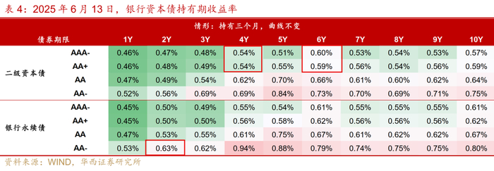 结合持有期收益率情况来看,2年AA-银行永续债或是占优选择。假设收益率曲线不变,计算持有3个月的持有期收益率,2年AA-永续债持有期收益率为0.63%,高于同品种、同等级的1年、3年。