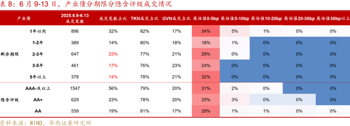 从经纪商成交来看,产业债买盘情绪继续上升,TKN占比从75%升至79%,低估值占比从63%升至65%。成交小幅缩久期,5年以上成交占比环比减少2pct至14%,而2-3年和3-5年环比增加2pct、1pct至23%、17%。各隐含评级成交占比变化不大,AAA-及以上、AA+和AA成交占比分别为56%、26%和17%,与前周基本持平。