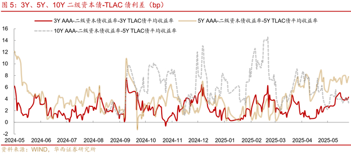 TLAC债方面,我们在报告《TLAC债,成交活跃的新品种》中,将3Y、5Y、10Y AAA-二级资本债到期收益率减去3+1、5+1和10+1 TLAC债平均收益率,得到各期限二级资本债-TLAC债的利差。其中,3Y利差普遍在0-5bp之间波动,5Y多在0-6bp内波动,10Y多在2-10bp内波动。截至2025年6月13日,3Y、5Y、10Y二级资本债-TLAC债的利差分别为4.3bp、7.8bp、3.4bp,其中3年、5年处于中枢偏高水平,10年处于中枢偏低水平,表明当前10年TLAC债比二级资本债更具性价比。