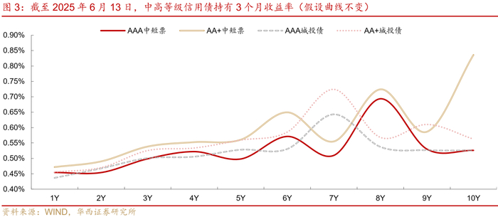 中高等级品种中,4年AAA中短票是值得布局的骑乘机会。以6月13日各品种收益率为基准,假设收益率曲线不变,计算持有3个月的持有期收益率,持有期收益率=票息收益+骑乘收益。从结果看,目前AAA中短票凸点在4年期,持有3个月收益率为0.52%,大于同评级的3Y和5Y(持有期收益率均为0.5%)。