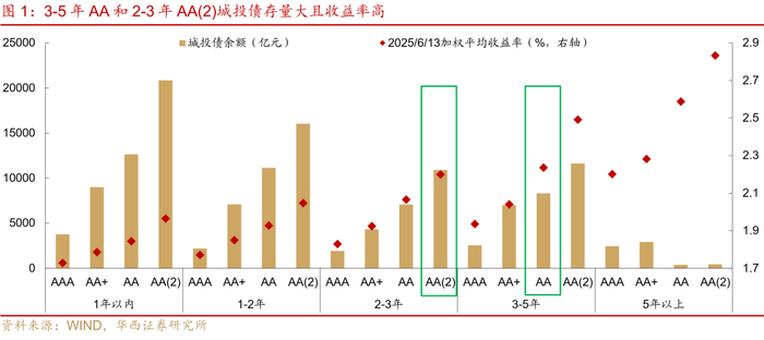 在此背景下,信用债投资不宜过度下沉和拉久期,尽量选择进可攻退可守的品种,即选择收益率相对较高、利差保护较厚,且具有一定流动性的品种。其中,3-5年AA和2-3年AA(2)城投债兼具票息和流动性,信用利差也具有一定的压缩空间,可作为进可攻退可守的配置品种。从存量城投债规模和收益率来看,截至2025年6月13日,3-5年AA和2-3年AA(2)城投债加权平均收益率在2.20%-2.24%之间,并且存量规模较大,分别有8314、10910亿元,可选范围较广。