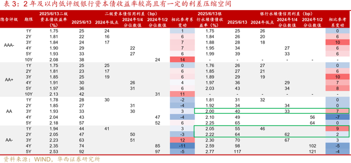 策略层面,一方面,3年AA和1-2年AA-银行永续债的到期收益率较高,且信用利差也有一定的压缩空间,可以作为票息打底资产。6月13日,3年AA和1-2年AA-银行永续债收益率在2%-2.22%之间,且1年 AA-银行永续债信用利差比2024年低点高9bp,2年AA-和3年AA永续债比2024年1/4分位数值高2-7bp,也均有一定的压缩空间。
