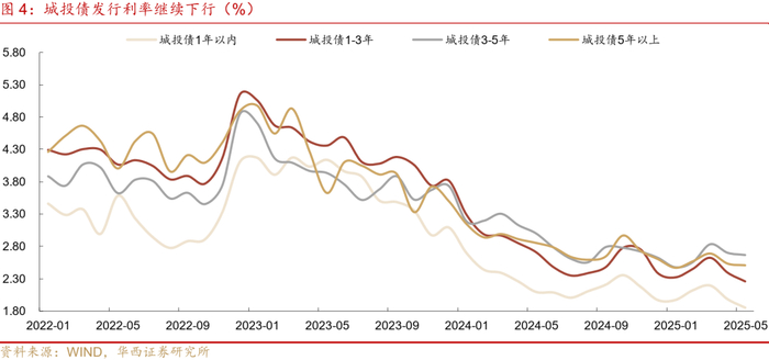发行利率继续下行。6月城投债发行利率继续下行,1年以内、1-3年、3-5年分别较5月下降15bp、3bp和17bp至1.7%、2.23%和2.49%,3年以内城投债发行利率继续创历史新低。