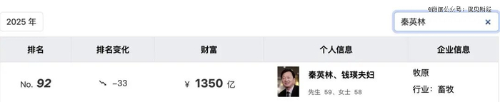 当下,尽管生猪养殖行业已经回暖,但市场偏好并未向该行业倾斜。受此影响,牧原股份创始人秦英林夫妇身家并未出现明显的增长,根据2025年胡润全球富豪榜单显示,其以1300 亿元身家位列全球第118位,排名下降26名,财富较2024年缩水约50亿元。