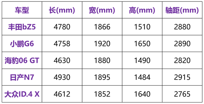 因为这种跨界身份,小鹏G6、大众ID.4系列都能算是bZ5的竞品,同为合资阵营的、但车身是C级轿车的日产N7,以及比亚迪的跨界SUV 海豹06 GT,也都和bZ5存在竞争关系。