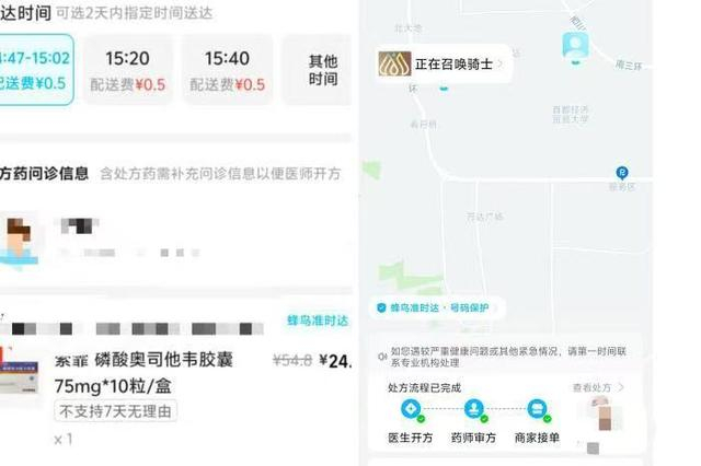 完成付款不到半分钟,就显示有骑手接单。记者发现,电子处方已自动生成,病症描述写为“咽炎”“流行性感冒”,从而使得症方匹配;病例信息一栏,则自动显示无过敏、无家族病史、肾功能正常等信息。