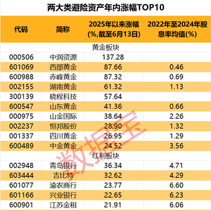 从市场表现来看,截至6月13日,上述110只避险个股年内股价平均涨幅达到4.17%,大幅跑赢沪深300指数(-1.8%)。黄金股表现极为优异,7只黄金股位居上述110只避险个股涨幅前7位,中润资源、西部黄金、赤峰黄金涨幅位居前3名,均超过85%。