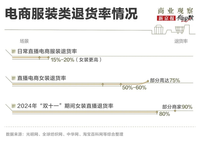 在电商服装退货中,女装品类的退货率最为突出。某头部购物平台服装类商品的日常退货率约为15%-20%,但女装因其“非标品”属性,退货率显著更高。根据全球纺织网数据显示,2024年“双十一”期间,女装直播退货率高达80%,部分商家甚至高达90%;中华网也指出,各平台大促期间的退货率,女装直播普遍维持在80%左右。