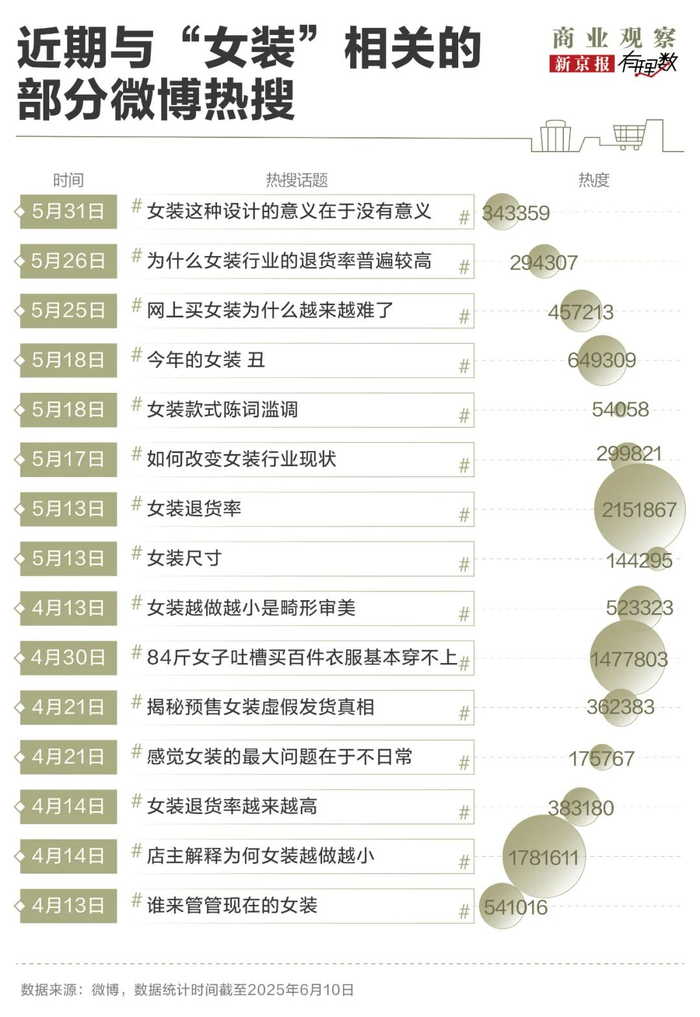 社交平台上,消费者对女装尺码的吐槽蔓延到了整个女装市场,包括不限于设计、款式、购买平台等多个方面。行业乱象导致消费者对女装市场不信任,消费信心大打折扣,购买欲降低,信任危机重构着当前的女装市场。