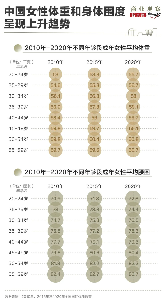 与此同时,从国家体育总局发布的三次全国国民体质监测数据来看,2010年至2020年间,中国20至59岁女性的平均身高、体重和腰围呈现持续上升趋势。其中,女性平均身高有所增加,体重和腰围等身体围度指标也在增长。这些数据说明,女性整体体型在近十年间出现了一定程度的变化,身体围度呈上升趋势。