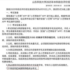 山东科技大学于6月10日发布的“2025年本科综合评价招生面试考生须知”中特别指出,不得使用红米系列手机参加考试。