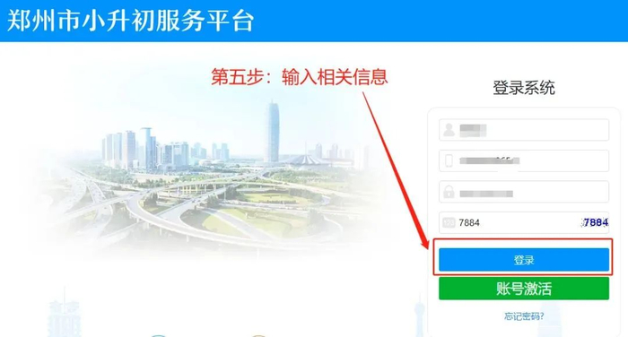 毕业生进行网上报名,首先通过计算机或手机访问“郑州市义务教育入学服务平台”(rxfw.zzedu.net.cn),选择“小升初入学服务”模块后,输入毕业生姓名、身份证号,经验证后,输入手机号码激活账户,进行密码设置。
