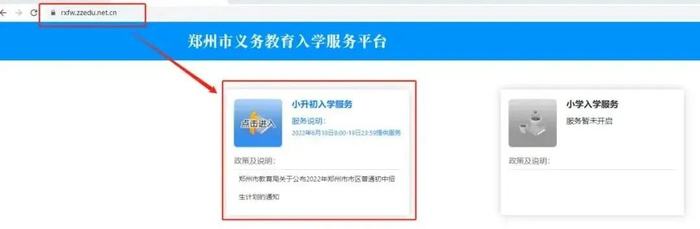 1.输入郑州市义务教育入学服务平台网址:rxfw.zzedu.net.cn,选择“小升初入学服务”模块