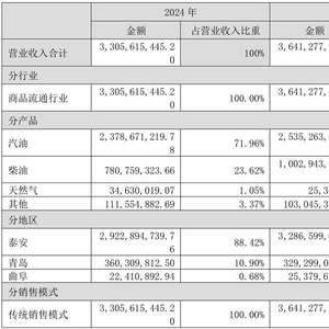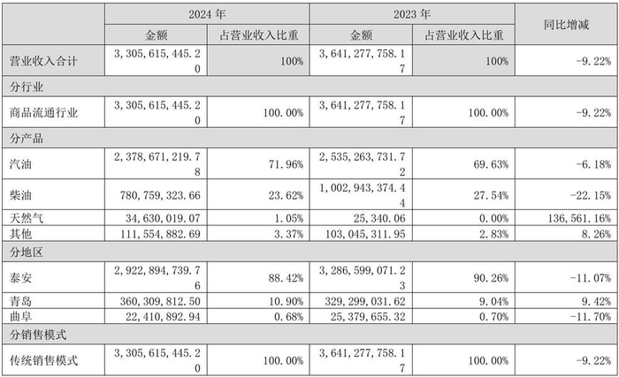 泰山石油日前向投资者披露,公司经营的加油站业务主要在泰安地区。其2024年半年报中披露“公司是山东省泰安市成品油最大经销商,市场占有率33%”,而2024年年报中则表示,“汽、柴油市场占有率同比提升0.46个、0.93个百分点”,这一数据没有限定在泰安地区。