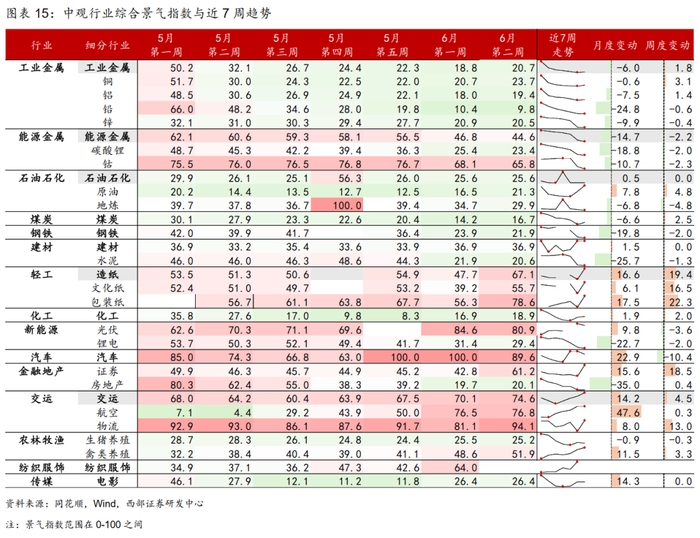 结合高频数据来看,当前上游工业品低位改善,上游价格中石化明显走强;制造运行相对较好,消费低位,养殖景气延续向好。从我们编制的中观行业综合景气指数来看,钴金属、轻工、汽车、交运、禽类养殖等在中高景气区间,汽车景气高位回落,物流、轻工造纸景气环比提升。
