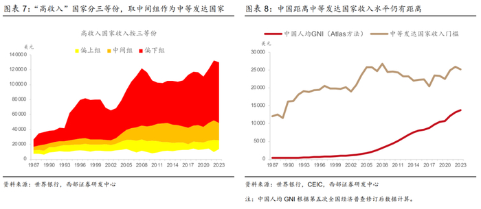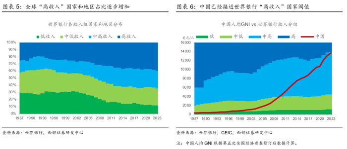 中国已经接近世界银行“高收入”国家的最低门槛。随着全球收入水平的增长,世界银行归类为“高收入”组别的国家和地区数目也在增加。根据世界银行最新基于2023年数据作出的收入划分,“高收入”国家和地区人均国民总收入阈值是14005美元,全球有86个国家和地区归入“高收入组”,占比40%,比1987年“高收入组”比例25%大幅增加(图表5)。世界银行数据集中的中国收入仍然是第五次全国经济普查前的数据。我们利用第五次全国经济普查修订后数据,按照世界银行Atlas方法更新中国人均国内总收入,2023年为13754美元,已经接近世界银行“高收入”阈值,仅相差2%左右(图表6)。