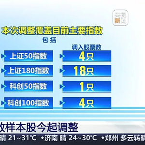 近日,沪深交易所和中证指数有限公司纷纷发布重要指数样本股调整公告,包括深证成指、创业板指、上证50、上证180、沪深300、中证500等指数样本股都将进行调整,今天(6月16日)起正式实施。