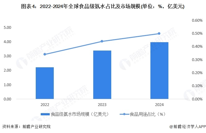 根据市场调研,全球食品用途的比重在缓慢增长,主要原因包括成本因素、技术进步、环保要求以及认证壁垒的降低。前瞻通过初步测算得到,全球食品级氨水用途占比从2022年0.34%升至2024年0.5%,核心驱动力源于技术突破与市场动态的协同作用。结合Market and Market的氨水市场规模进行初步测算,2022-2024年全球食品级氨水从2.22亿美元上升到3.97亿美元,年复合增速为34%。