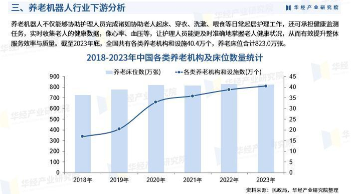 养老机器人不仅能够协助护理人员完成诸如协助老人起床、穿衣、洗漱、喂食等日常起居护理工作,还可承担健康监测任务,实时收集老人的健康数据,像心率、血压等,让护理人员能更及时准确地掌握老人健康状况,从而有效提升整体服务效率与质量。截至2023年底,全国共有各类养老机构和设施40.4万个,养老床位合计823.0万张。