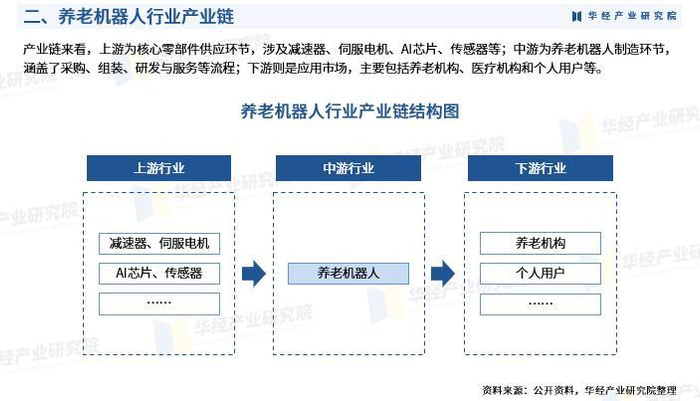 产业链来看,上游为核心零部件供应环节,涉及减速器、伺服电机、AI芯片、传感器等;中游为养老机器人制造环节,涵盖了采购、组装、研发与服务等流程;下游则是应用市场,主要包括养老机构、医疗机构和个人用户等。