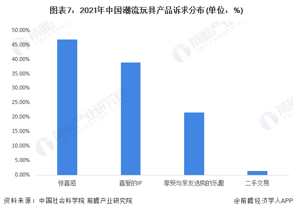 根据中国社会科学院国情调查与大数据研究中心发布的《2021中国潮流玩具市场发展报告》,46.78%的消费者认为惊喜感是进行潮玩消费的主要原因。可见,潮玩产品的核心诉求集中在社交和自我愉悦上,而交易投资并非消费者购买潮玩的主要动机。