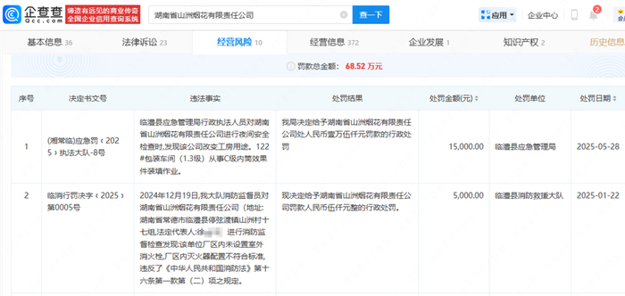 值得注意的是,湖南山洲烟花公司今年已分别被临澧县应急管理局、消防救援大队行政处罚,违法事实涉及该公司改变工房用途、厂区内未设置室外消火栓,厂区内灭火器配置不符合标准,最近的一则处罚在事故发生前19天。