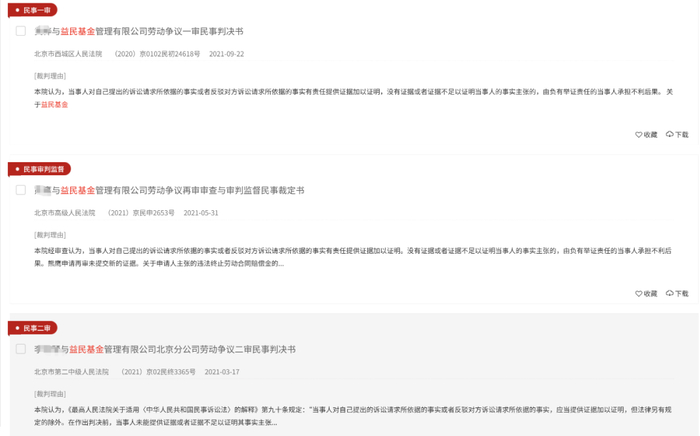 同时,前员工讨薪官司不断,益民基金成了“被告专业户”。裁判文书网上关于随便一搜就可以看到不少相应的案例。媒体也曾报道,2022年,益民基金前总经理黄某在离职后将老东家告上法庭,要求支付超过200万元薪酬。