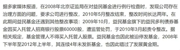 这是怎么回事呢?据媒体报道,2008年被北京证监局查出治理问题,要求公司进行整改,2010年5月整改结束。但是,在整改期间益民基金又遇到其他整改事项。所以,2008年下半年至2012年上半年,四年没发新基金,错过了行业发展黄金期。之后就一路下滑,再也没缓过来。