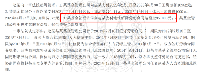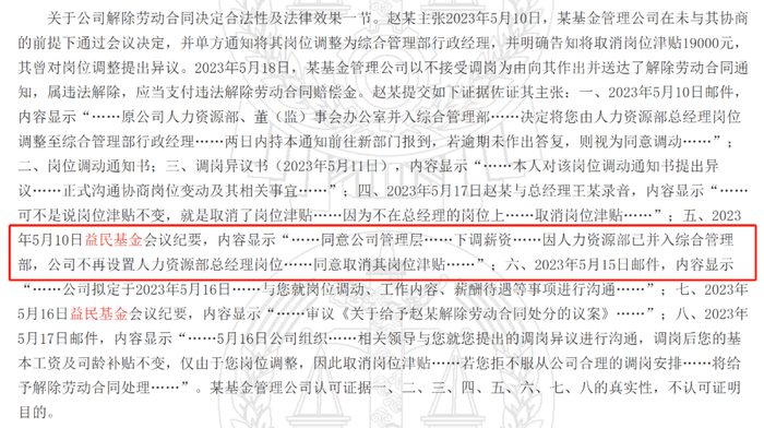 司机根据线索在裁判文书网上看到了这个公布于2024年底的《民事判决书》。判决书可以看到,赵某在益民基金干了13年,从人力资源主管一路做到人力资源部总经理,妥妥的公司“老人”。但在2023年5月,公司突然发了个《岗位调动通知书》,把他从HRD直接调到综合管理部当行政经理。