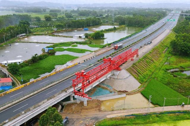6月14日8时许,岑大公路荔玉路共线段扩容工程中的车陂江大桥开启首片预制T梁架设,这也标志着该项目正式进入架梁建设新阶段。